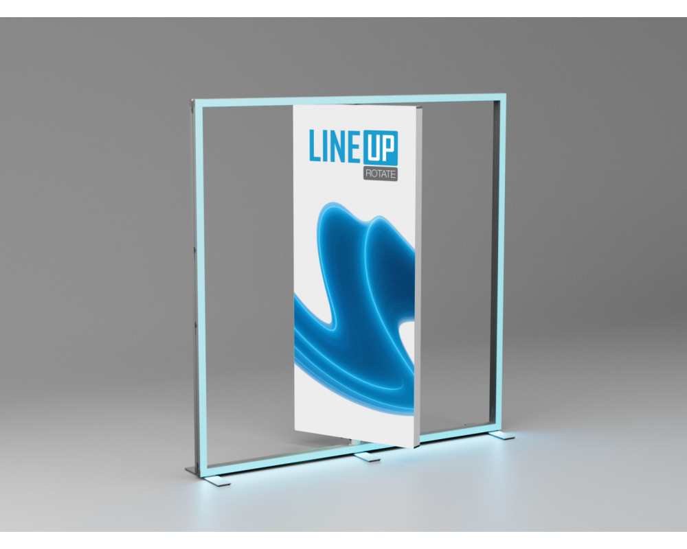 LINEUP rotate ist die neue, drehbare Erweiterung für das LINEUP System und sorgt für Bewegung und doppelte Aufmerksamkeit bei Events und Präsentationen. Das beleuchtete Rotationsmodul misst immer 100 cm in der Breite und ist beidseitig mit Stoff bespannbar – perfekt für wechselnde Werbebotschaften oder doppelseitige Designs. Die Höhe des rotate systems passt sich der Gesamthöhe des LINEUP systems an:
